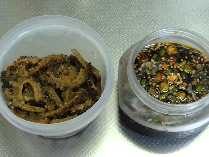 食べきれないゴーヤは佃煮に、とうがらしは醤油漬けにしました。
